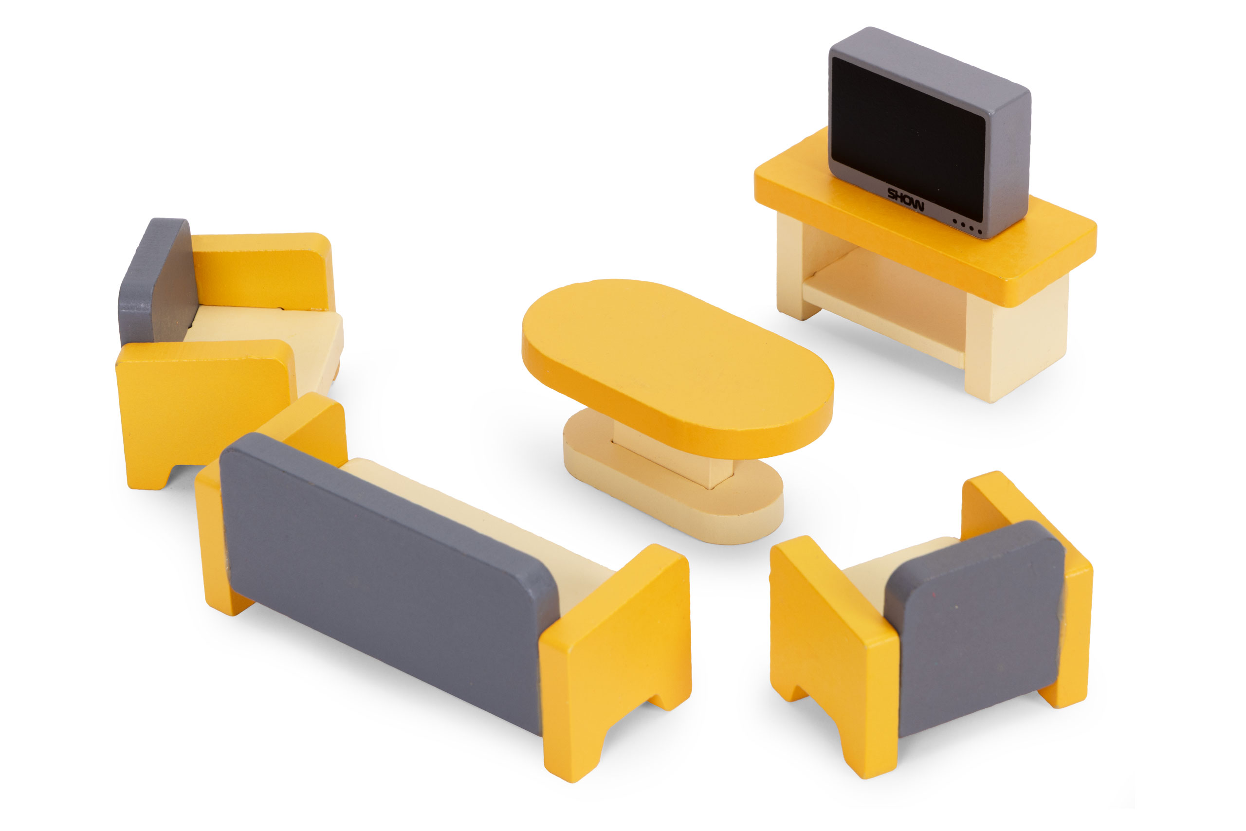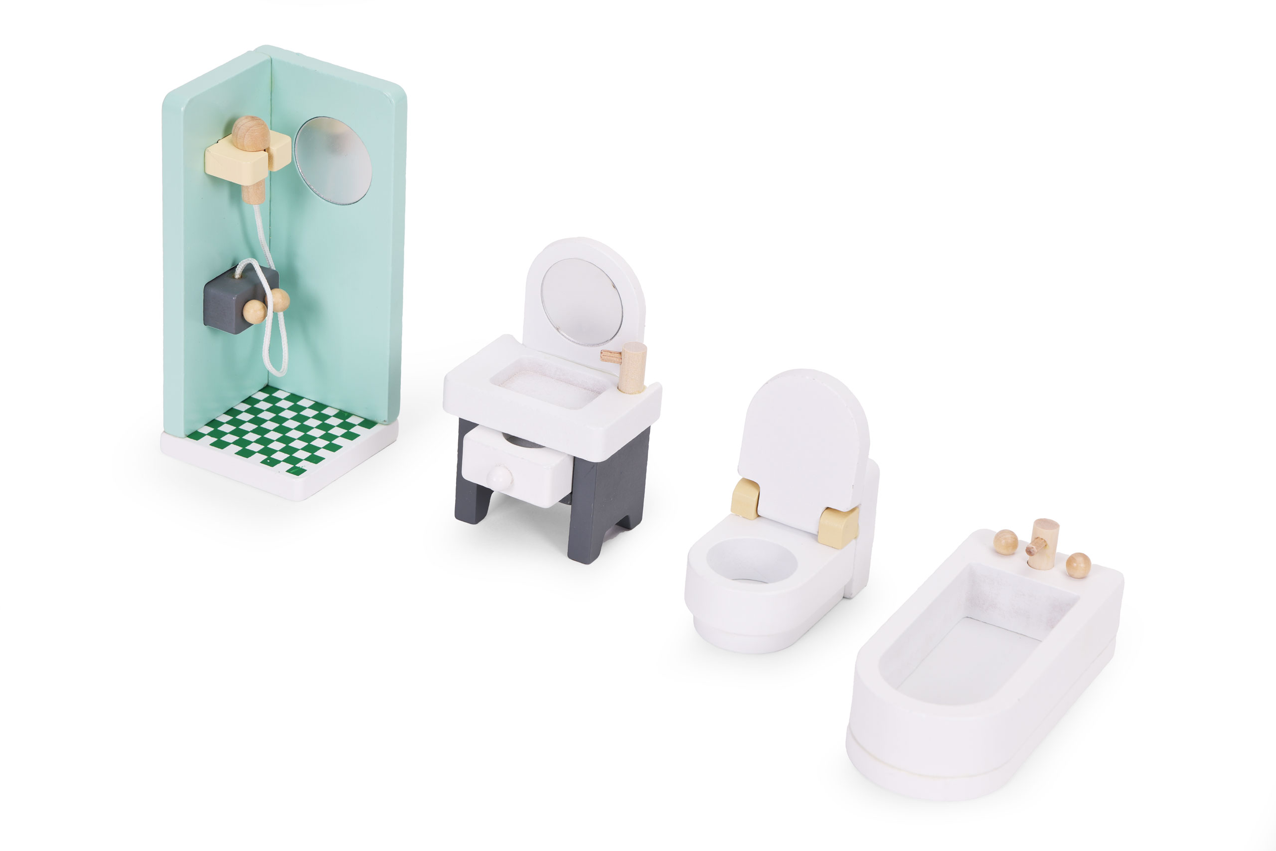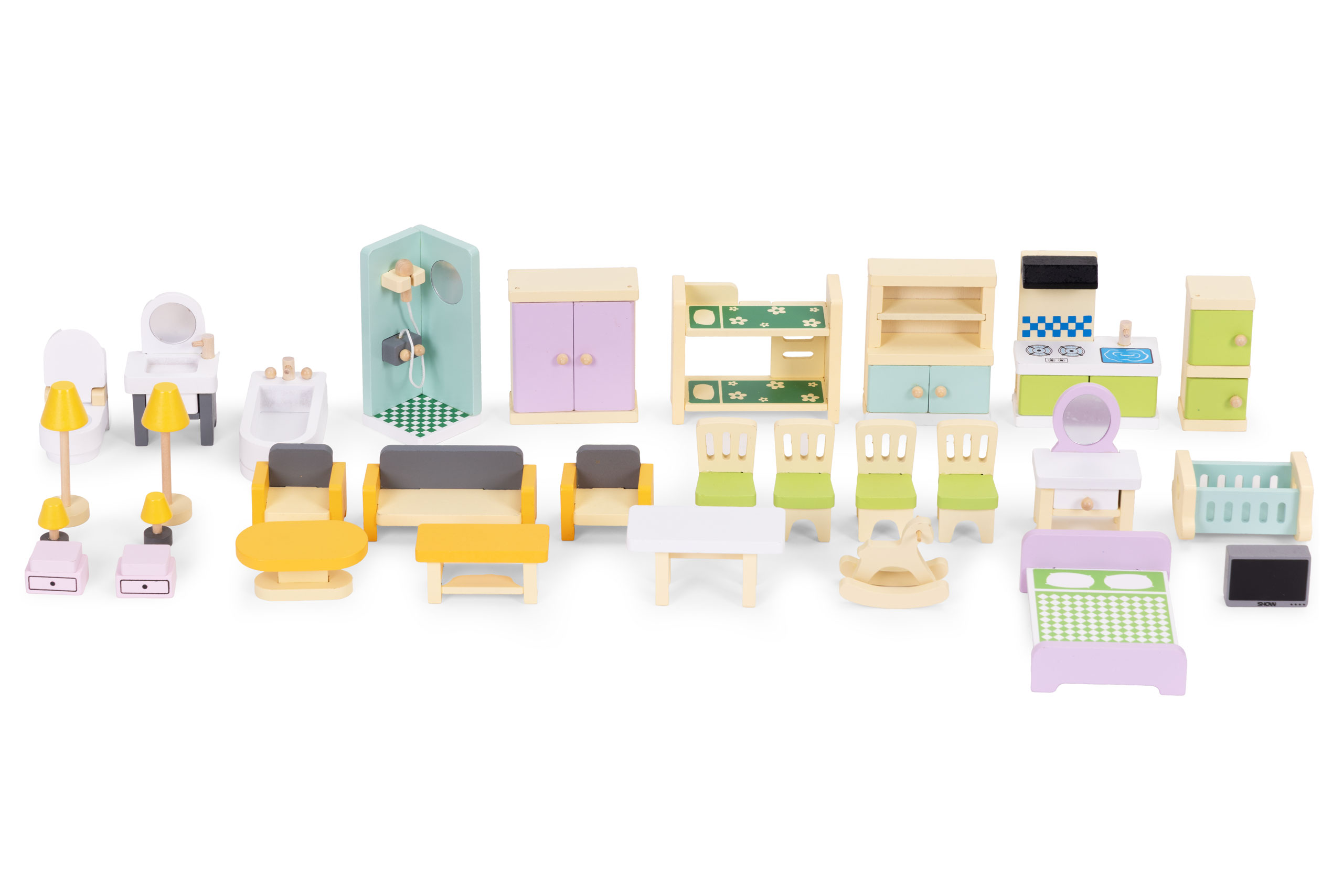 Zestaw zawiera 30 drewnianych mebelków i akcesoriów.