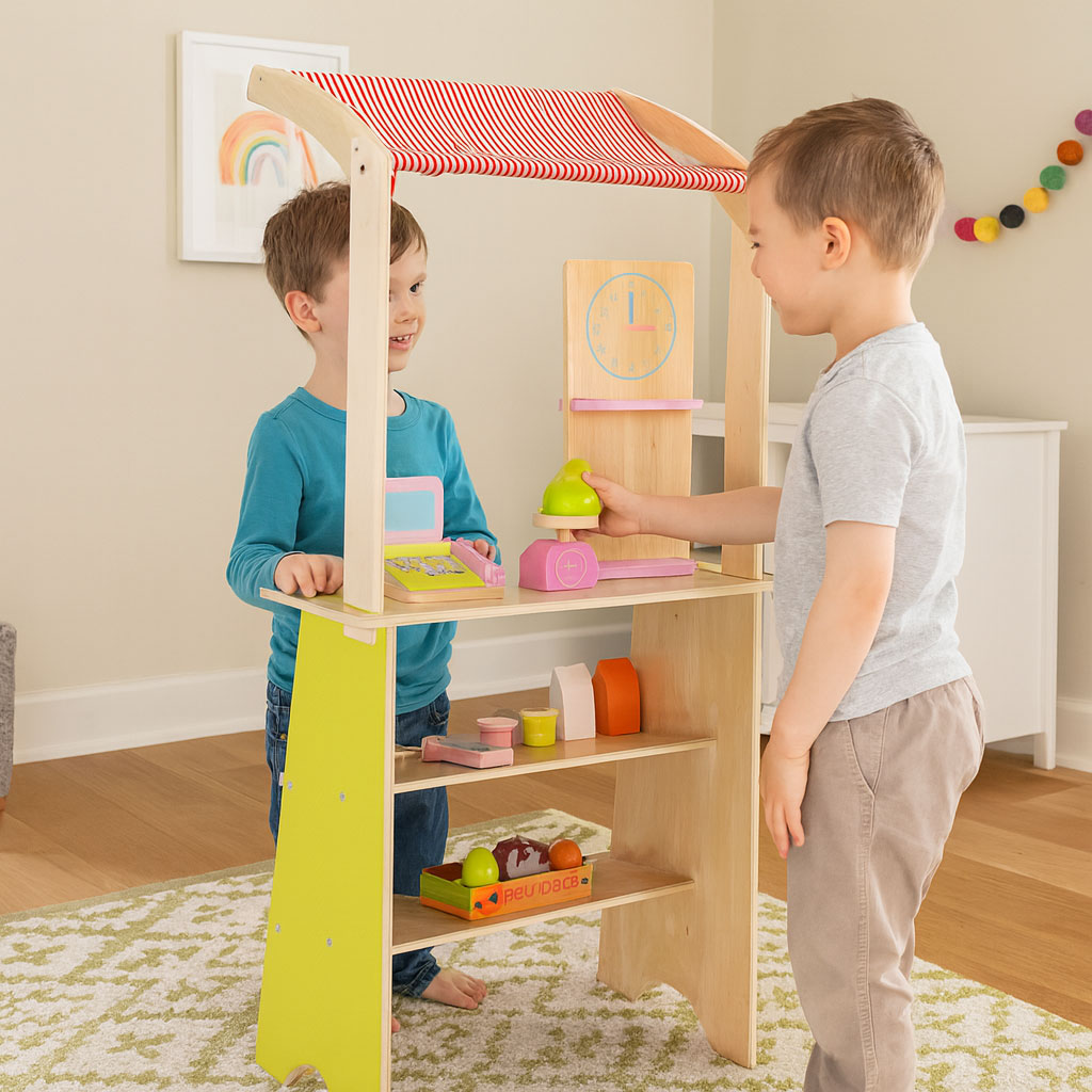 Zabawa w sklep to jedna z najbardziej lubianych form odgrywania ról przez dzieci. Maluchy z radością wcielają się w sprzedawców, klientów i tworzą własne historie, które rozwijają wyobraźnię oraz uczą funkcjonowania w świecie dorosłych. Drewniany Stragan dla Dzieci ECOTOYS to zabawka, która pozwala w pełni przeżyć te doświadczenia w bezpieczny i realistyczny sposób.