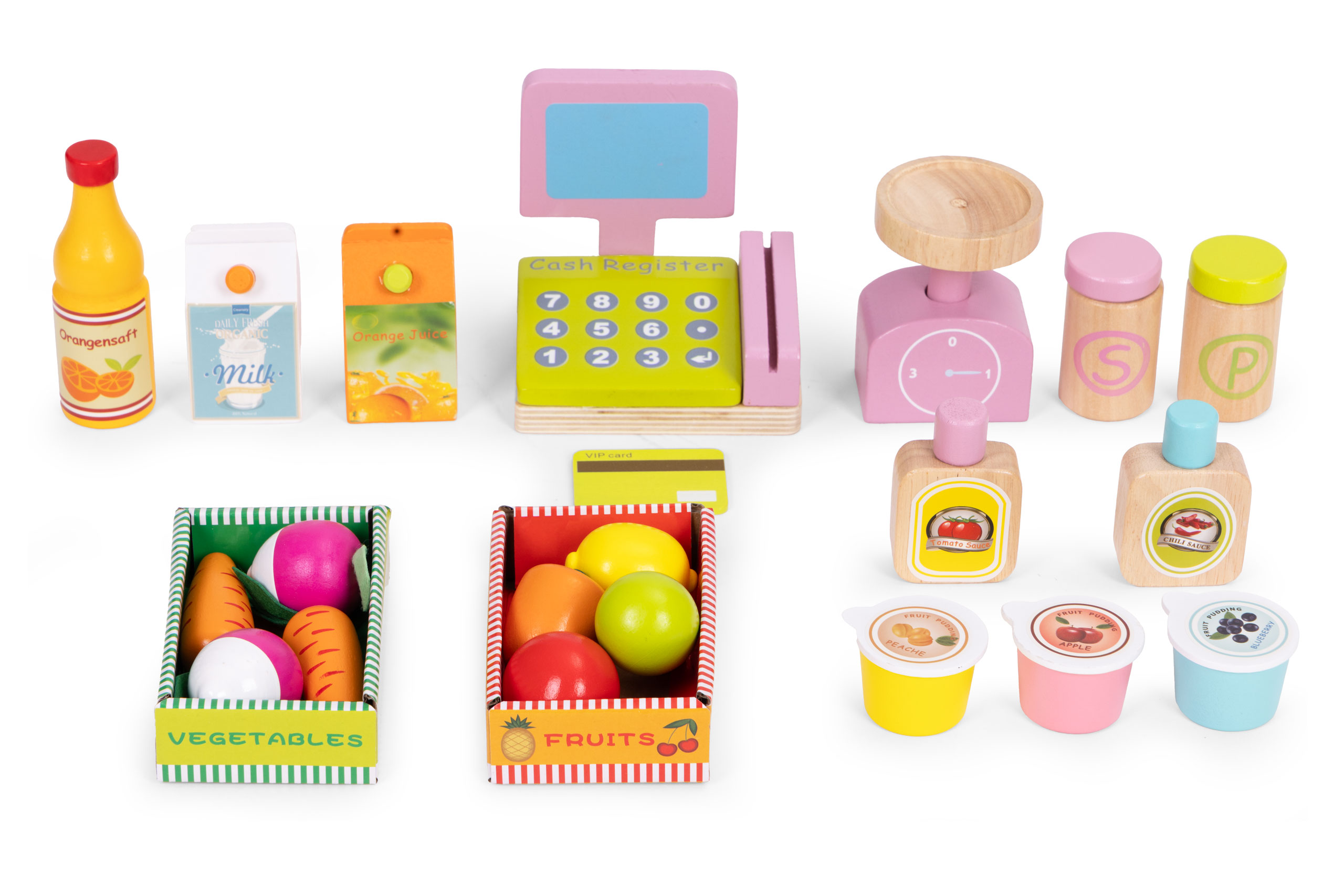 W komplecie znajdują się m.in. kasa fiskalna z terminalem, waga, warzywa, owoce, produkty spożywcze takie jak mleko, soki, dżemy czy przyprawy. Dzięki temu dziecko może wcielić się w rolę sprzedawcy i prowadzić własny sklepik.
