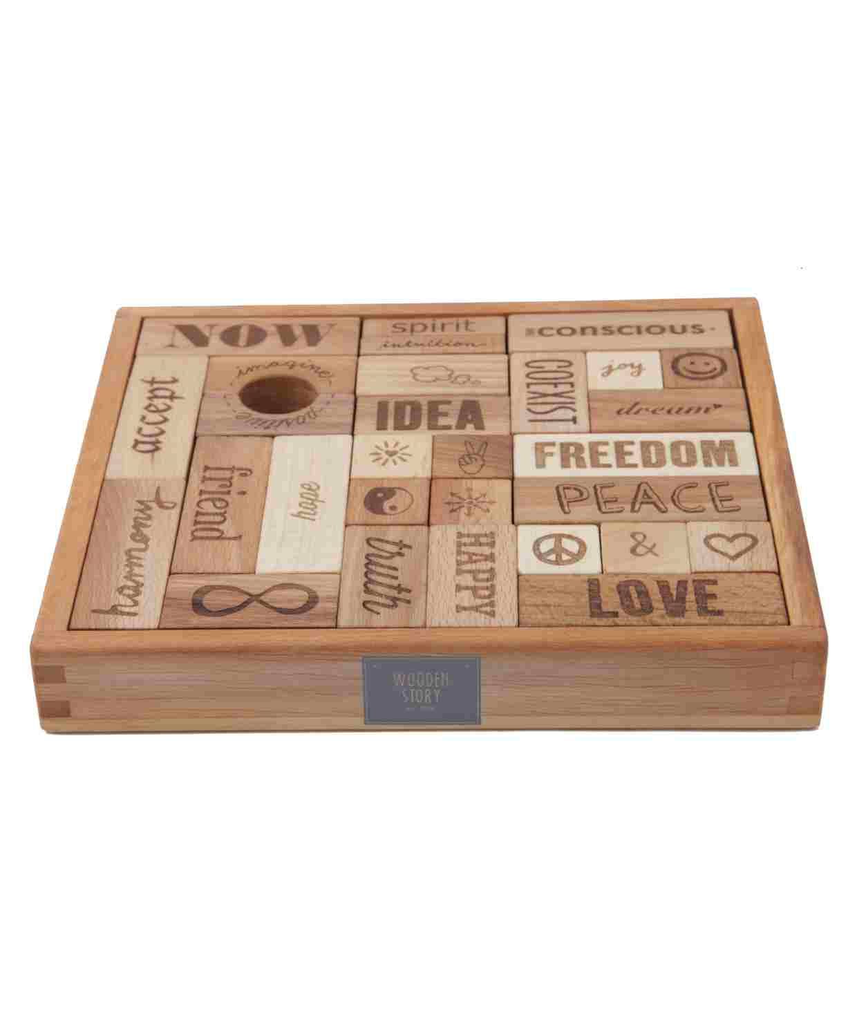 Drewniane klocki Peace & Love w skrzynce Wooden Story – Klocki z przesłaniem miłości, natury i spokoju