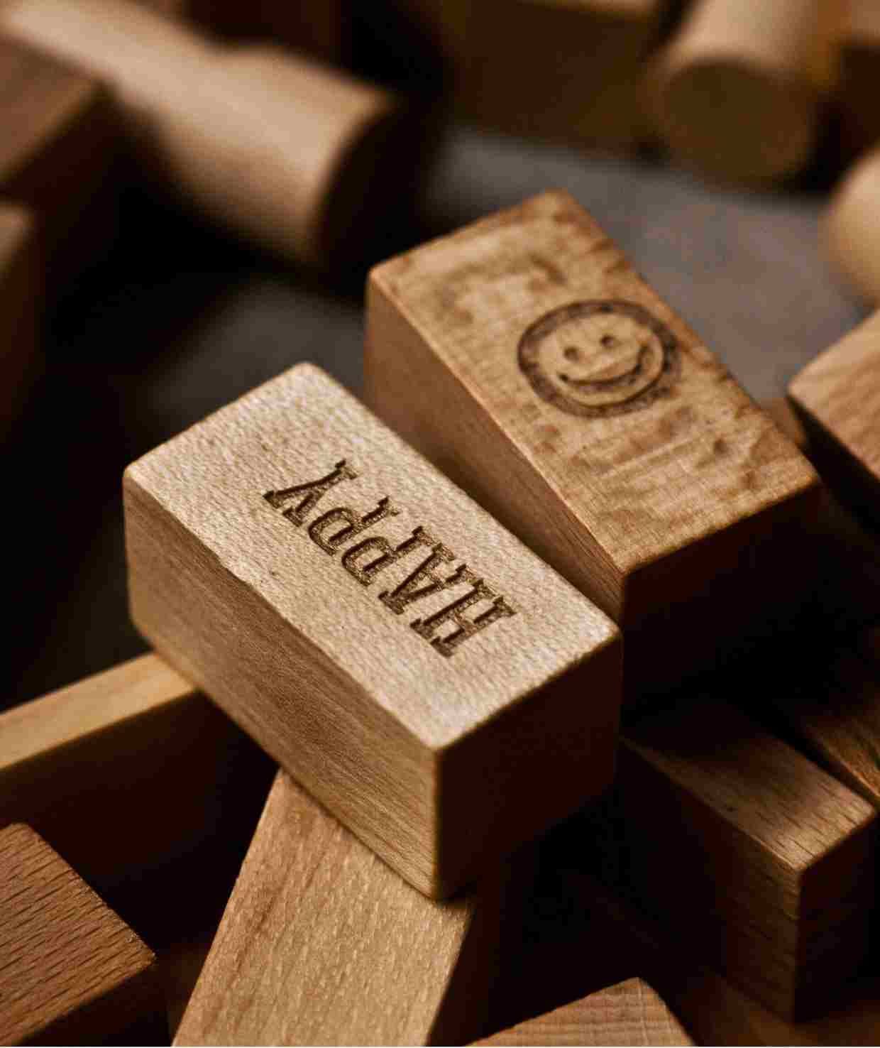 Drewniane klocki Peace & Love w skrzynce, które niosą przesłanie