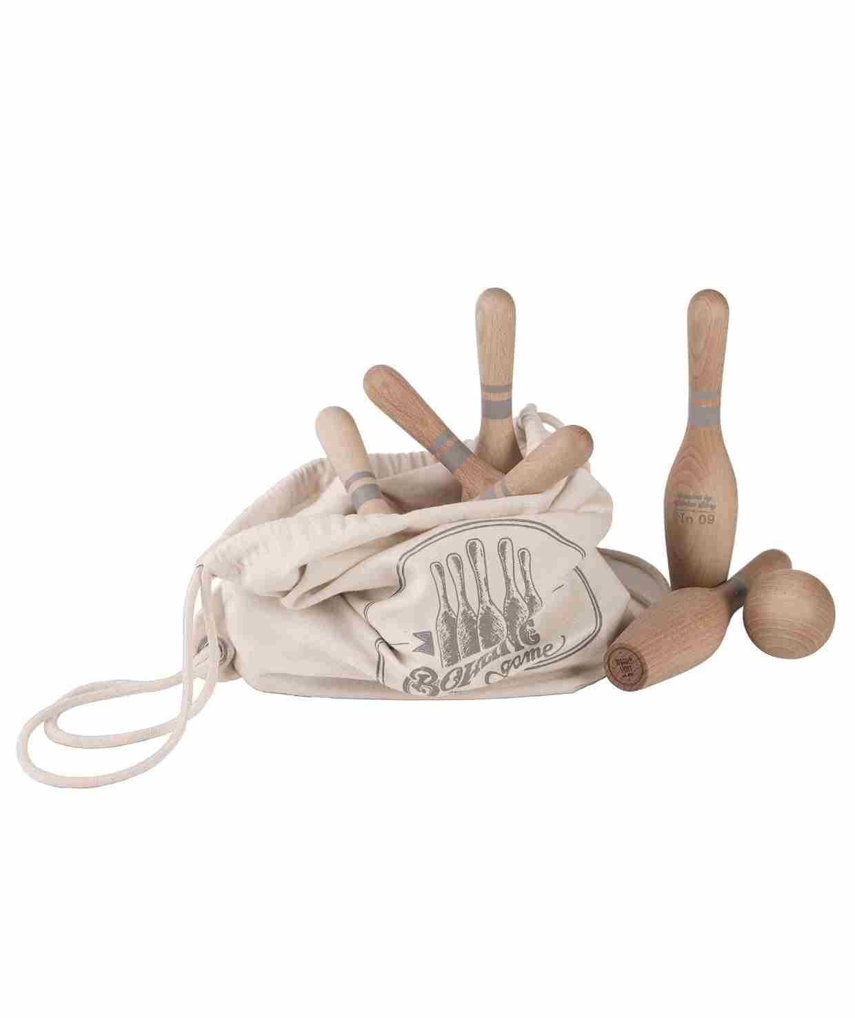 W zestawie: 10 kręgli + 2 kule + worek z bawełny